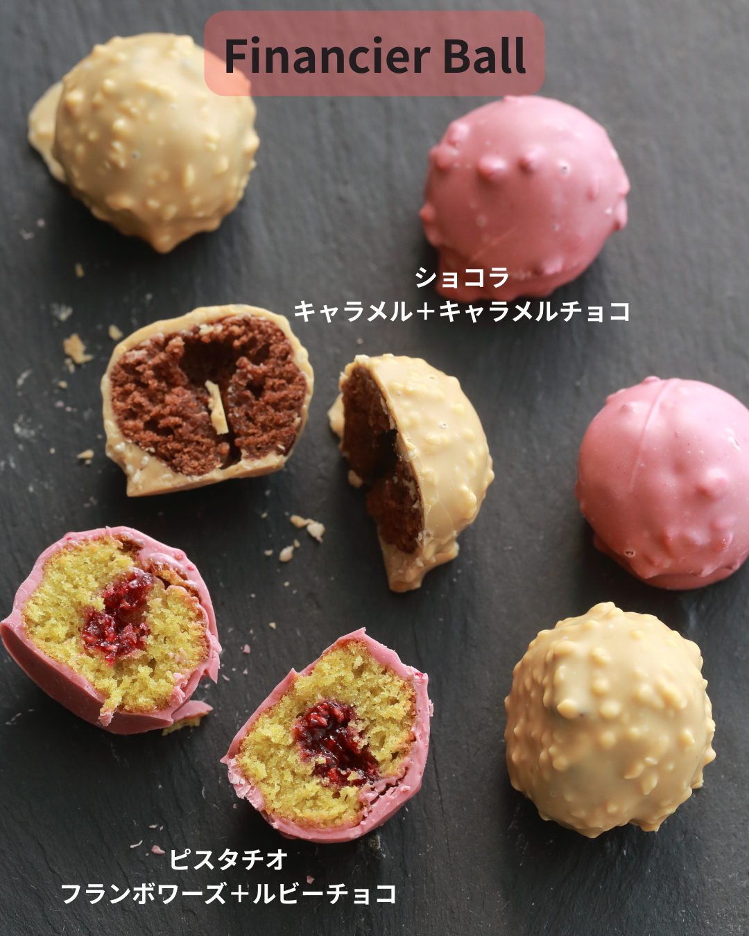 ボール状に焼成したフィナンシェをチョコレートでコーティング。ショコラのフィナンシェには中心にキャラメルが入っていてキャラメルアーモンドチョコをコーティング。ピスタチオのフィナンシェには中心にフランボワーズジャムが入っていて希少性の高いピンクのチョコレート(ルビーチョコ)をコーティングしています。BOXには各5個ずつ入っています。